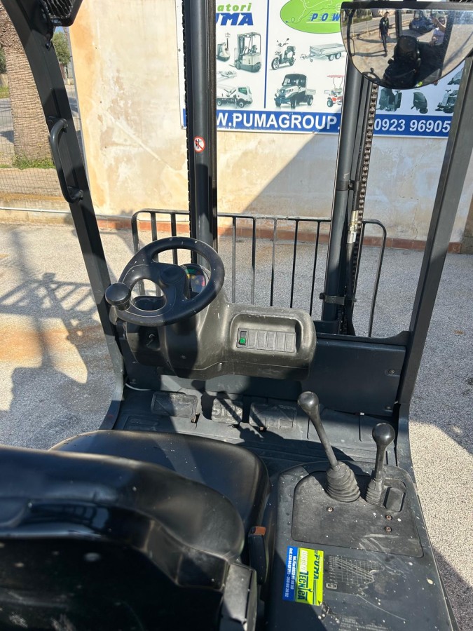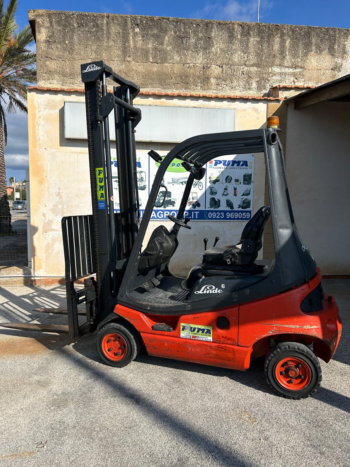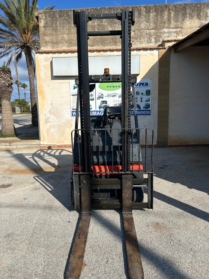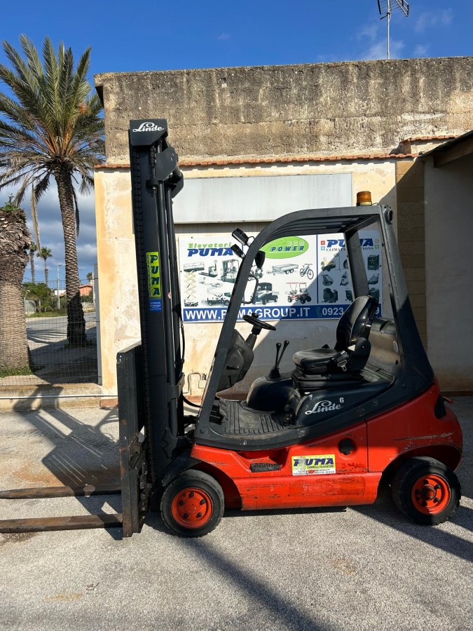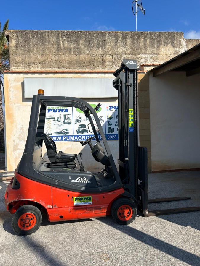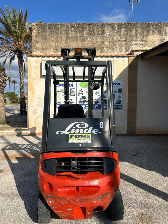 Carrello elevatore diesel marca Linde modello H18D-03, portata 1.800 kg, montante simplex con altezza di sollevamento 3.800 mm, gommatura super elastica, traslatore, tettuccio, III° via idraulica