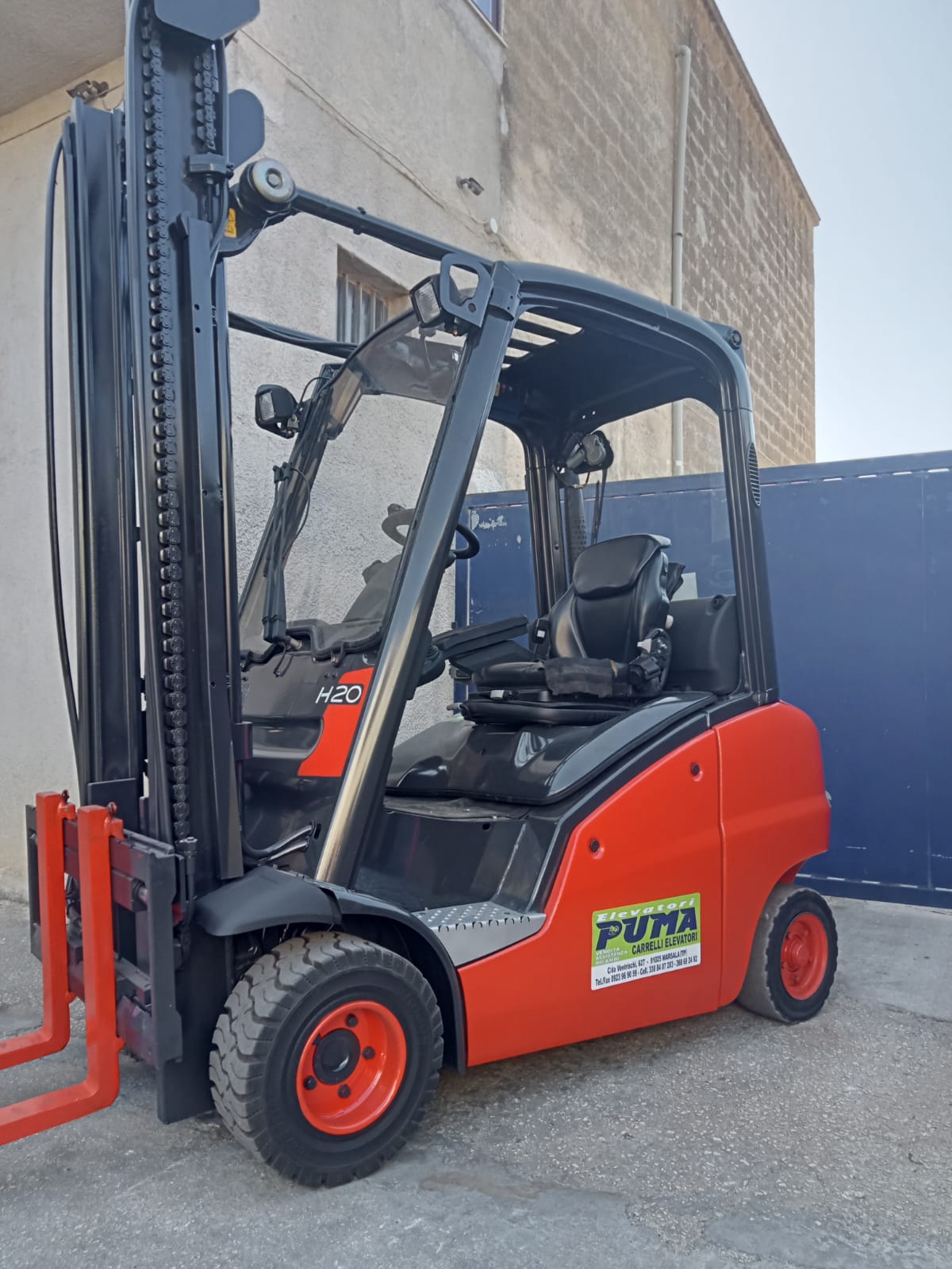 Carrello elevatore diesel Linde H20D, anno 2008, portata 2000 kg, montante simplex 3800 mm, IV via idraulica, Semicabinato, Parabrezza, servosterzo, trasmissione idrostatica, doppio pedale parabrezza, tergicristalli, sedile comfort ammortizzato, cinture di sicurezza, fanaleria anteriore e posteriore, lampeggiatore, cicalino retromarcia, contaore, coppia forche.