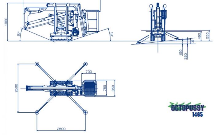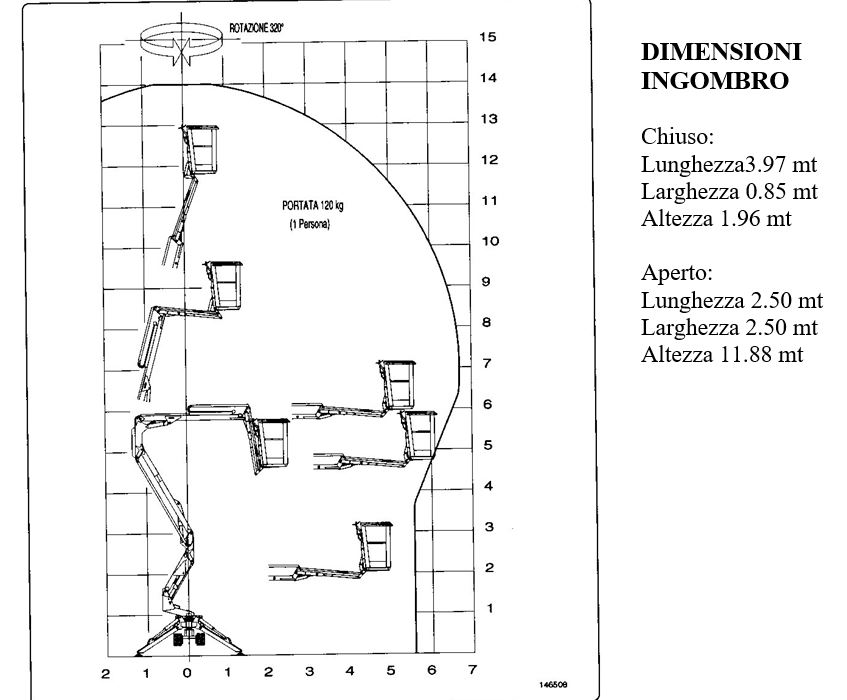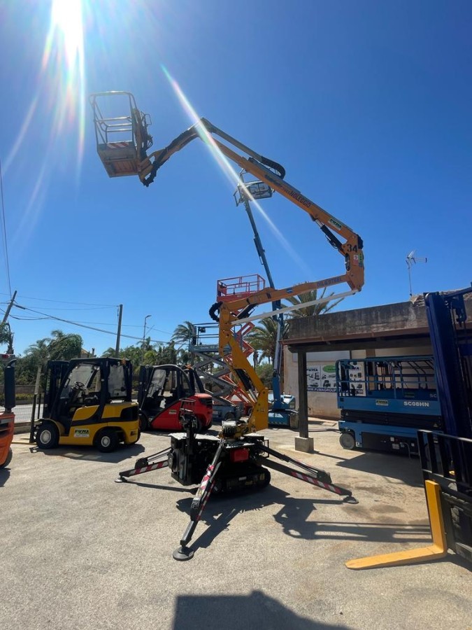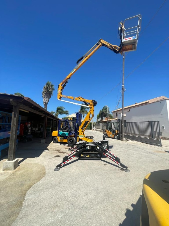 Piattaforma aerea ragno cingolato Oil&Steel modello Octopussy 1465, elettro/diesel portata 120 kg, anno 2002, altezza uomo 12 mt., altezza lavoro 14 mt. Dimensioni ingombro chiuso: lunghezza 3.97 mt, larghezza 0.85 mt, altezza 1.96 mt Dimensioni ingombro aperto: lunghezza 2.50 mt, larghezza 2.50 mt, altezza 12.00 mt