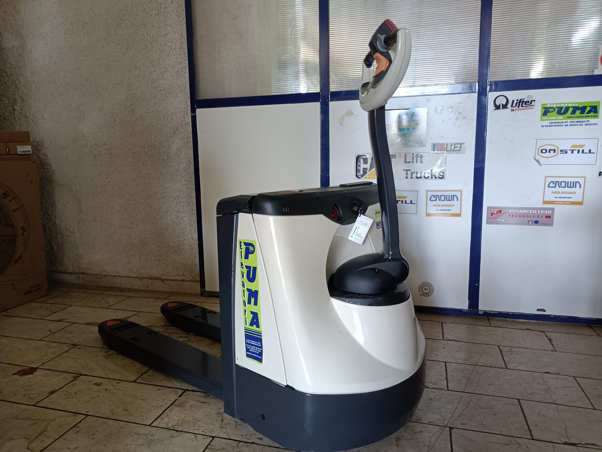 Elevatori Puma rivenditori carrelli e macchine da magazzino Crown Transpallet elettrico marca Crown modello WP2315 anno 2004 portata 1600 kg versione europallet, dimensioni forche 550x1150, monorullo, batteria 80%, carica batterie incorporato