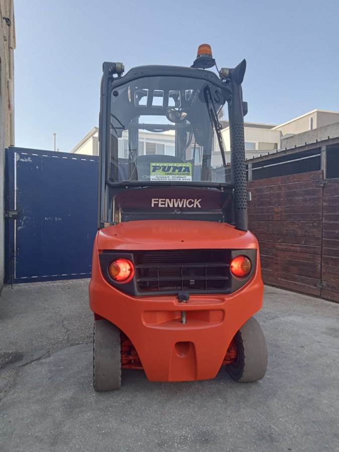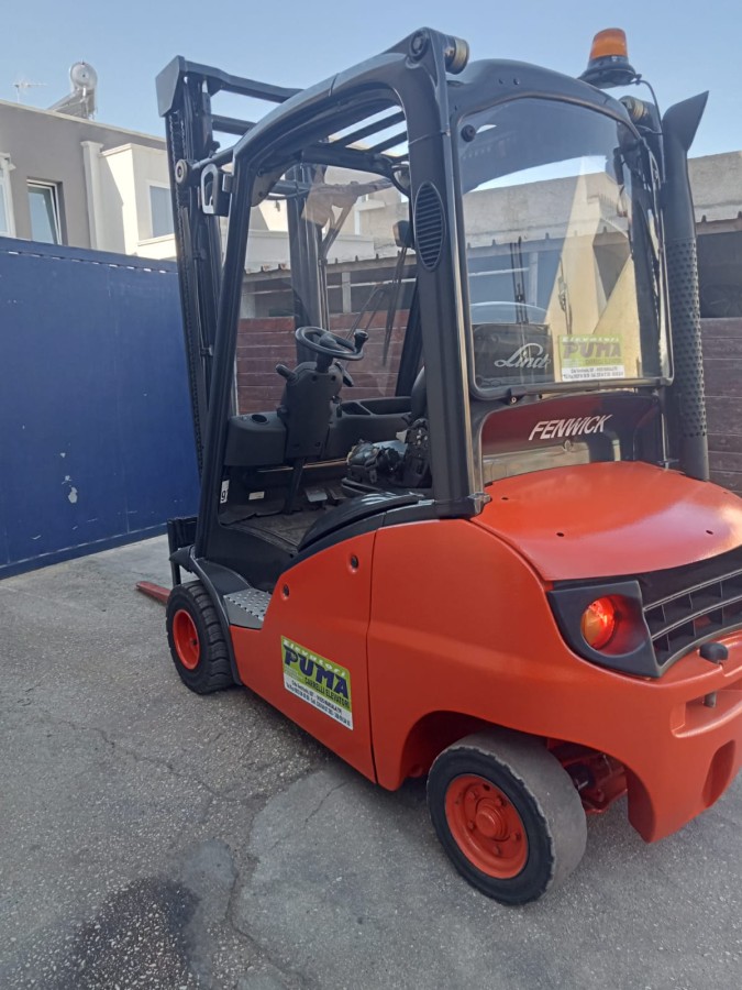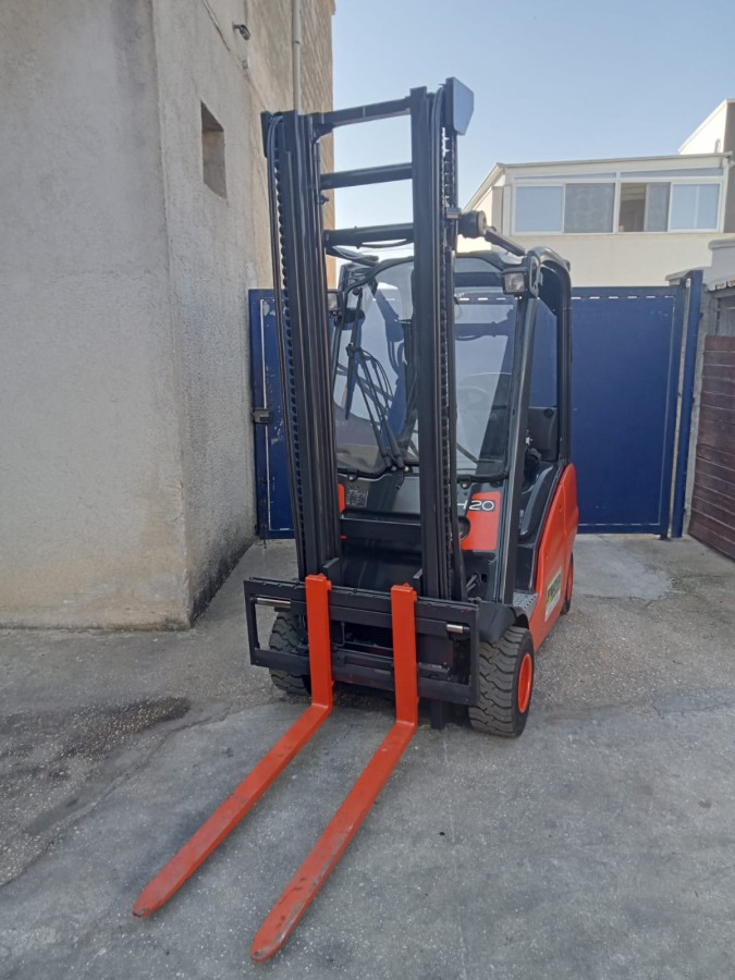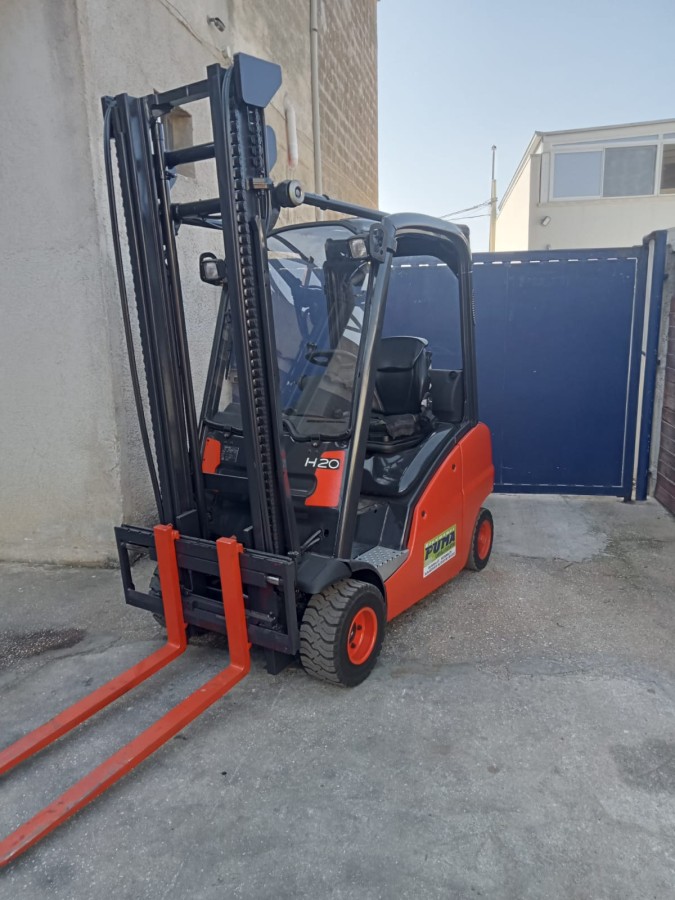 Carrello elevatore diesel Linde H20D, anno 2008, portata 2000 kg, montante simplex 3800 mm, IV via idraulica, Semicabinato, Parabrezza, servosterzo, trasmissione idrostatica, doppio pedale parabrezza, tergicristalli, sedile comfort ammortizzato, cinture di sicurezza, fanaleria anteriore e posteriore, lampeggiatore, cicalino retromarcia, contaore, coppia forche.