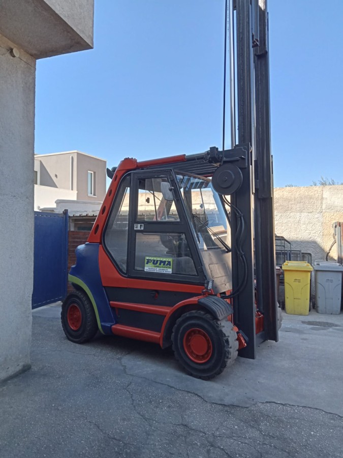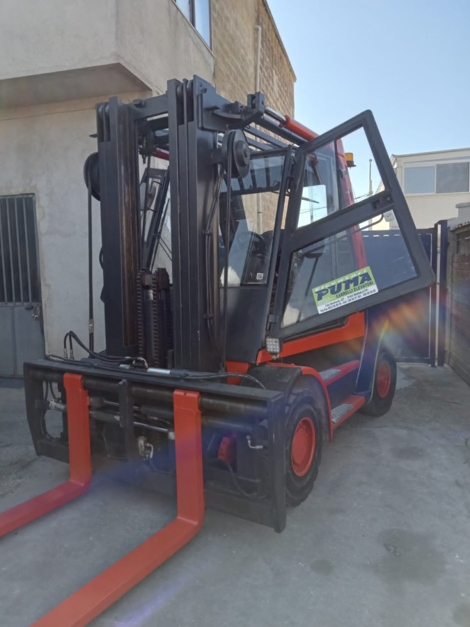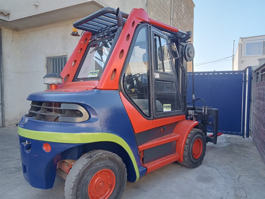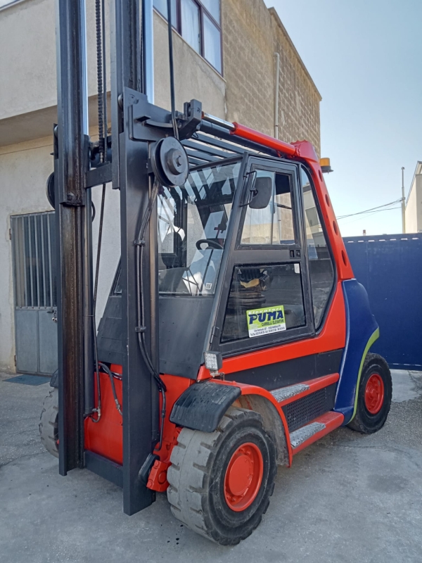 Carrello elevatore diesel Linde H50D, anno 1996, portata 5000 kg, montante triplex GAL 5500 mm, traslatore laterale integrato, cabina completa, IV via idraulica, posizionatore forche