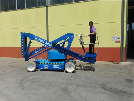 Piattaforma articolata elettrica Upright modello AB38, anno 1999, portata 215 kg (max.2 persone), pendenza superabile 36%, batteria 24V, carica batteria incorporato, gommatura cushion Antitraccia, altezza uomo 11.50 mt, altezza lavoro 13.50 mt