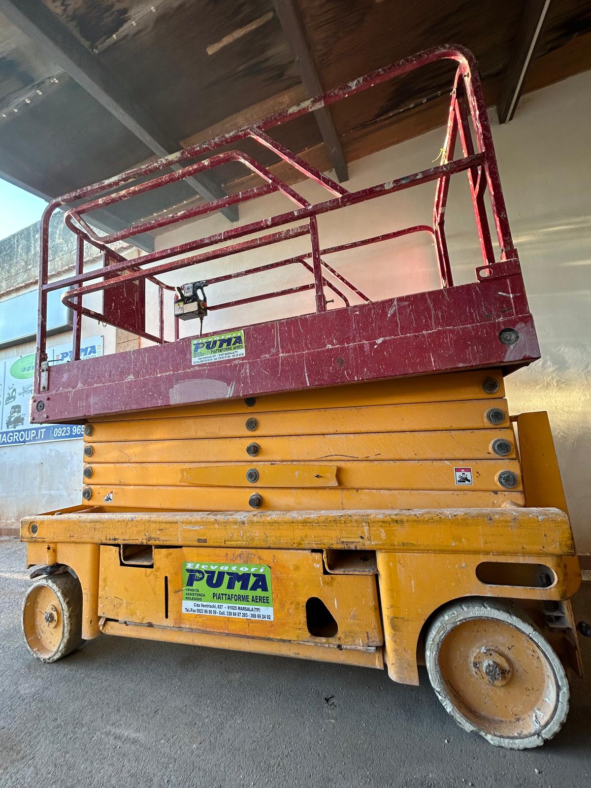 Piattaforma a pantografo Haulotte Compact 12, anno 2007, portata 300 kg, peso a vuoto kg 2470, larghezza mm 1200, lunghezza mm 2310, altezza mm 2390, altezza uomo 10000 mm, altezza lavoro 12000 mm