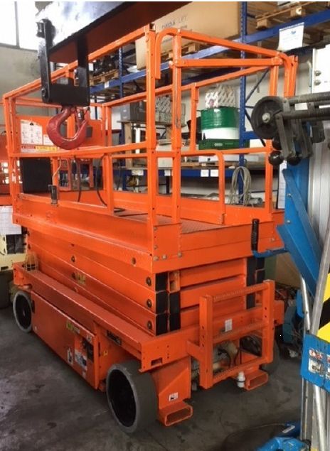 Piattaforma a pantografo JLG modello 2646ES portata 250 kg, anno 2002, peso a vuoto kg 2110, larghezza mm 1150, lunghezza mm 2500, ingombro chiusa mm 2250, altezza uomo 8000 mm, altezza lavoro 10000 mm