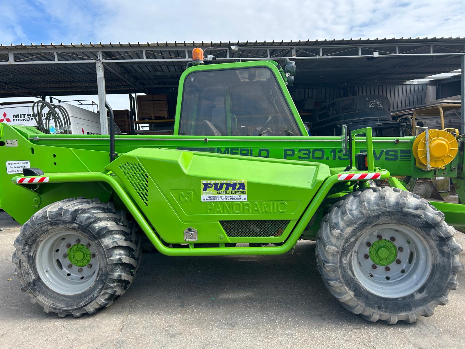 TELESCOPICO MERLO P3013EVS Portata 3000 kg, ingombro minimo 2500 mm, montante triplex, con altezza di sollevamento 13000 mm, anno 1997 Stabilizzatori, coppia forche per palette, gru a bandiera, correttore di pendenza, benna, cabinato