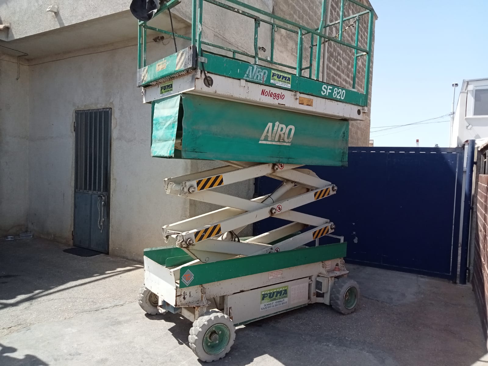 Piattaforma a pantografo Airo modello SF820, portata 250 kg, altezza uomo 8200 mm, altezza lavoro 10200 mm, ingombro chiuso 2250 mm, peso a vuoto 2000 kg, larghezza 1400 mm, lunghezza 2600 mm