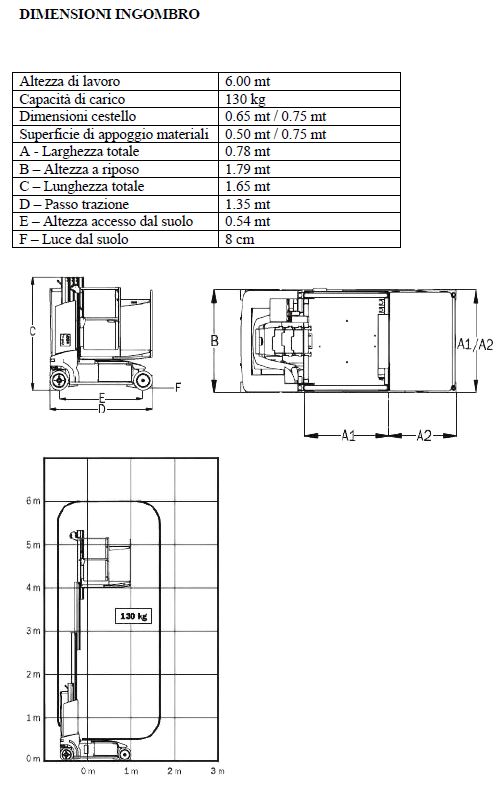 Altezza uomo 4000 mm, altezza lavoro 6000 mm, dimensioni cestello 0.65 mt / 0.75 mt, superficie di appoggio materiali 0.50 mt / 0.75 mt, larghezza totale 0.78 mt, altezza a riposo 1.79 mt, lunghezza totale 1.65 mt, passo trazione 1.35 mt, altezza accesso dal suolo 0.54 mt – Luce dal suolo 8 cm