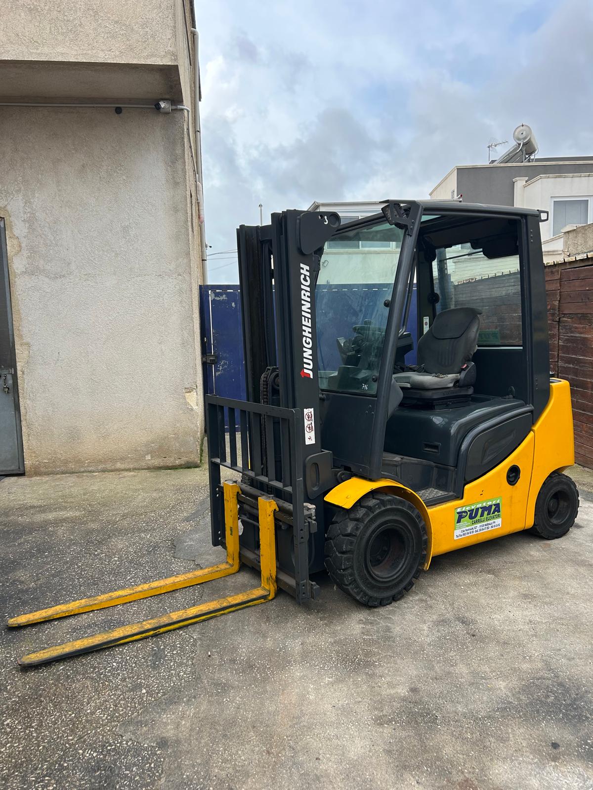 Traslatore laterale, servosterzo, trasmissione idrostatica, comando minileve, 4° via idraulica, semicabina in vetro di sicurezza, tergicristalli, sedile comfort ammortizzato, cinture di sicurezza, fanaleria anteriore e posteriore, lampeggiante, cicalino retromarcia, contaore, coppia forche.