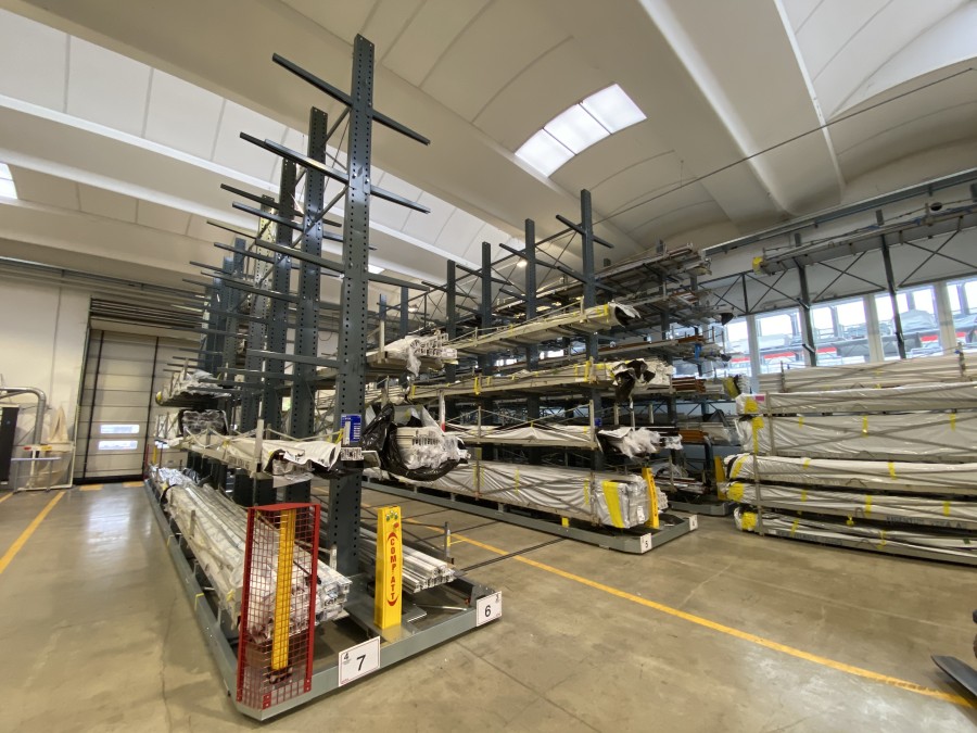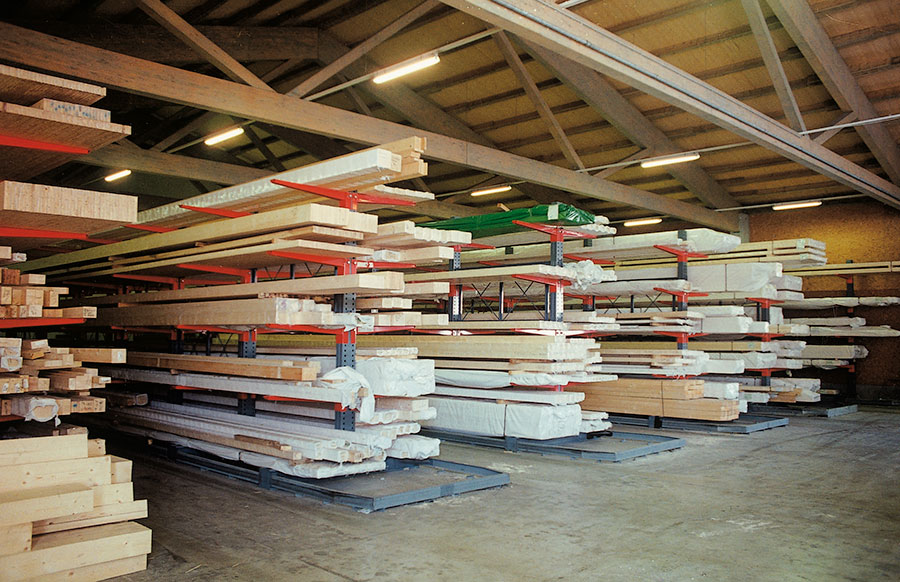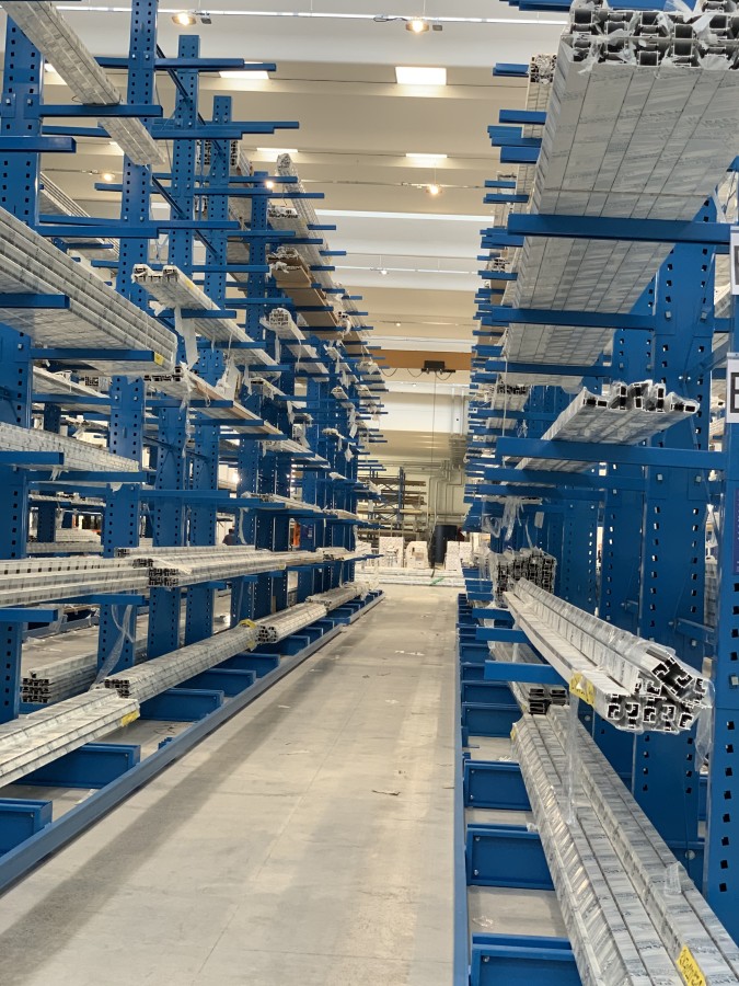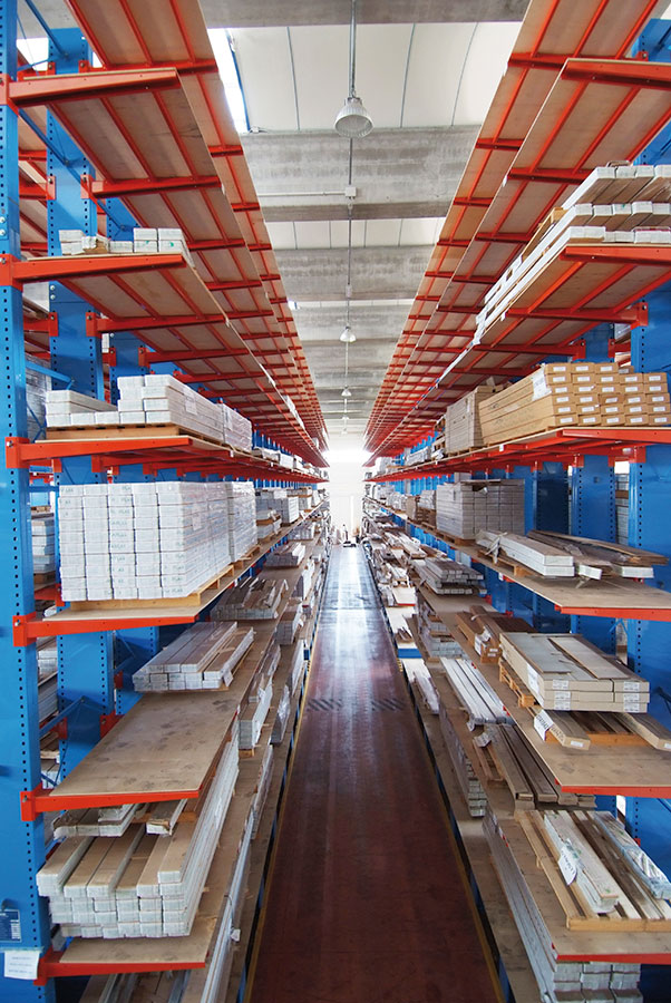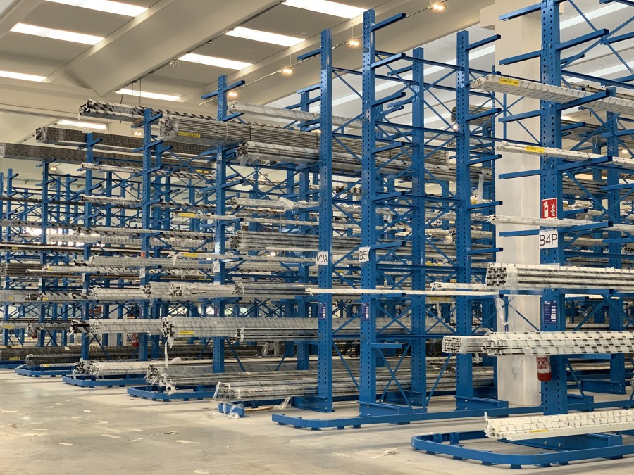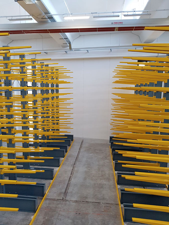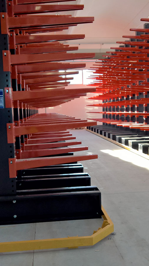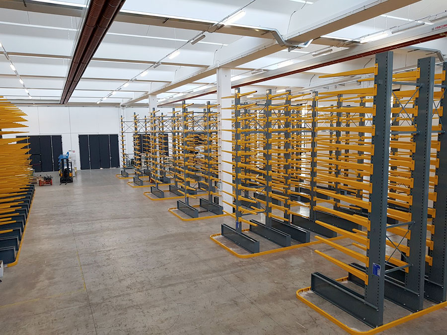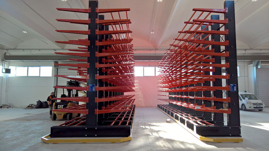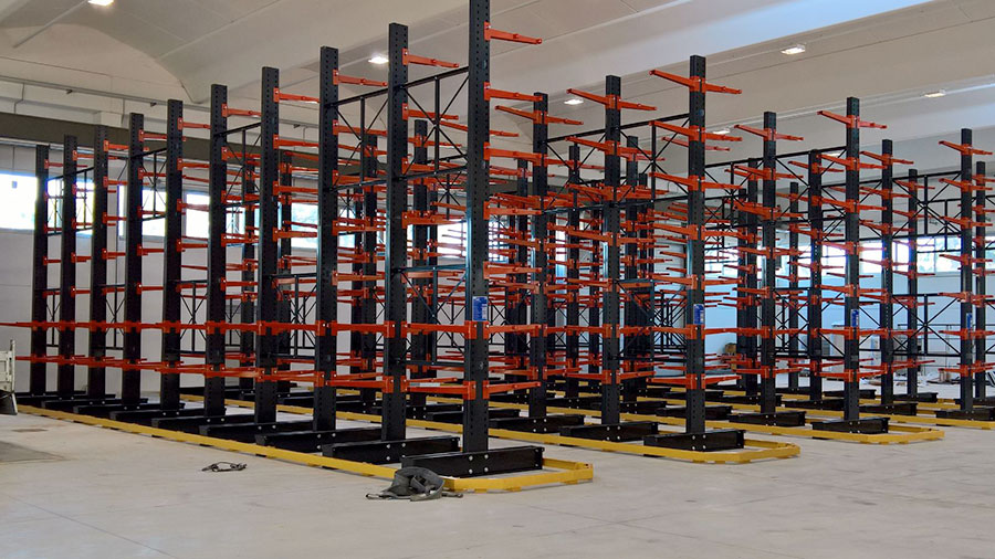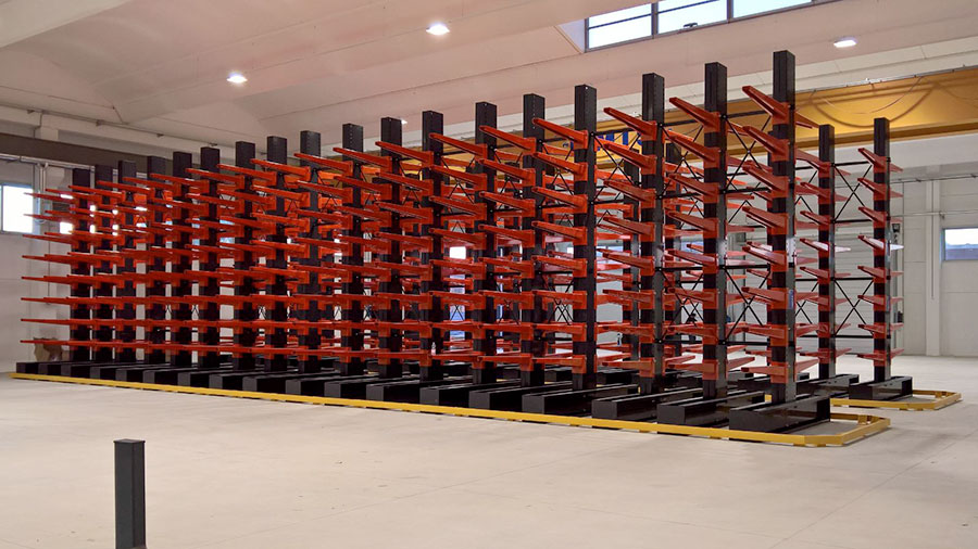Cantilever, scaffalature metalliche a quattro elementi: colonna, braccio, spina, crociera.