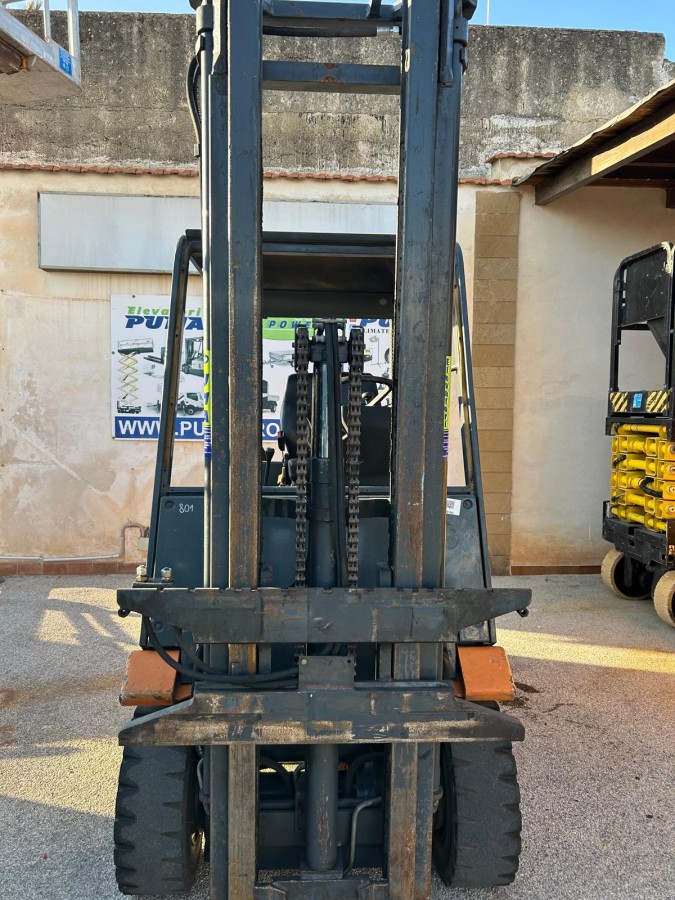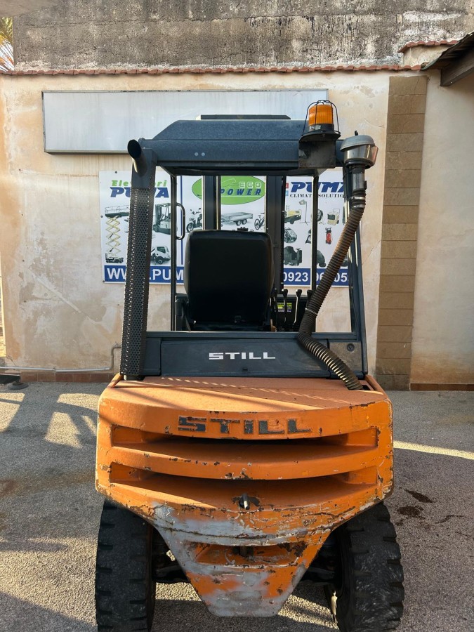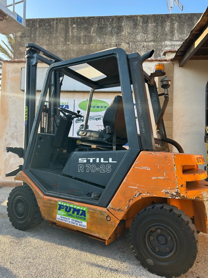 Carrello elevatore diesel Marca Still modello R70-25 anno 2003, portata 2500 kg, ingombro minimo chiuso 2500 mm, montante triplex con alzata 4200 mm, gommatura super elastica anteriore e posteriore misura 23x9-10, IV° via idraulica, leve di comando, tettuccio, lampeggiante, cicalino di retromarcia