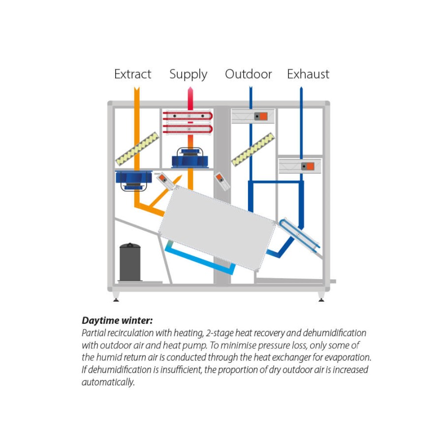 DanX HP coniuga i punti di forza di un sistema a pompa di calore a quelli di un sistema che deumidifica sfruttando l'aria esterna. La pompa di calore e lo scambiatore a doppio flusso incrociato ad alta efficienza, combinati insieme, regolano accuratamente sia l'umidità che le temperature all'interno del locale piscina.